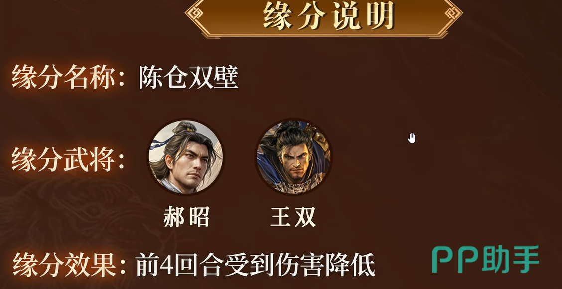 缘分组合方面,“陈仓双壁”是郝昭最契合的搭档体系,绑定武将为王双。该缘分生效后,双方在战斗前4回合内共同享受伤害减免效果。该时段恰为敌方爆发峰值期,有效缓解开局压力,大幅提升阵容容错率。两位将领均属防御向定位,叠加后整体坦度跃升至T0梯队。