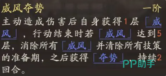 首先介绍张辽的核心天赋——威风夺势。此技能不仅可主动释放造成伤害,还能为自身叠加一层威风状态。每当行动结束时,若威风层数累计达到5层,即可自动消耗全部层数,清除所有计策的准备时间,并进入持续两回合的夺势增益状态。每层威风提供3%的物攻提升,最多叠加五层;而夺势则更为强势,直接提升15%的伤害输出,同时降低15%所受伤害。此外,在触发夺势的同时,还会对周围一圈敌军施加一次相当于其物攻50%的范围伤害,进一步强化战场压制力。