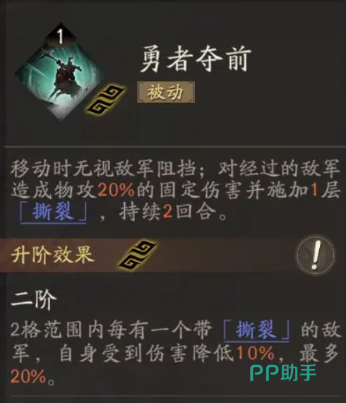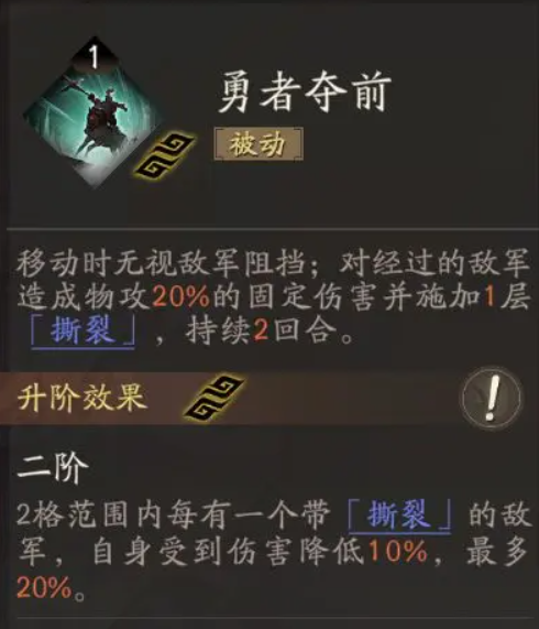 第三个技能勇者夺前属于被动类型,能够在张辽移动过程中发挥作用。只要其路径穿越敌方单位,即可无视阻挡完成位移,并对途经的每个敌人造成20%物攻的固定伤害。同时,每次穿越都会为目标附加一层撕裂,持续两个回合。此效果不仅能绕过防御值直接结算伤害,还具备真实伤害属性,实战表现极为出色。此外,每穿越一名敌人还可额外获得一层威风,极大加快核心状态的积累速度。