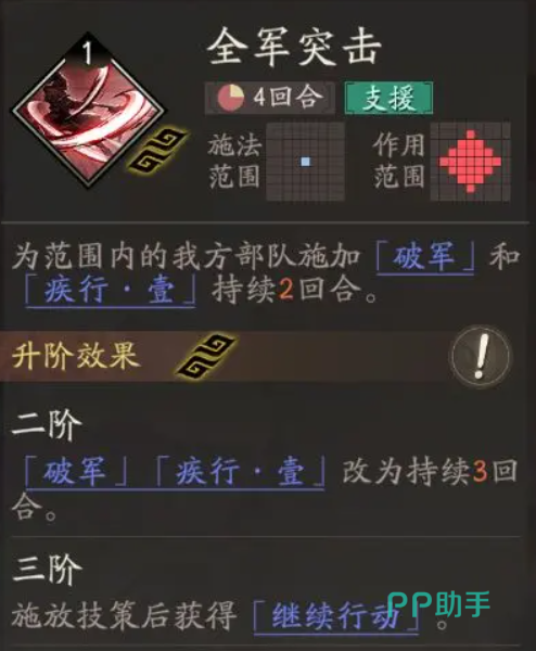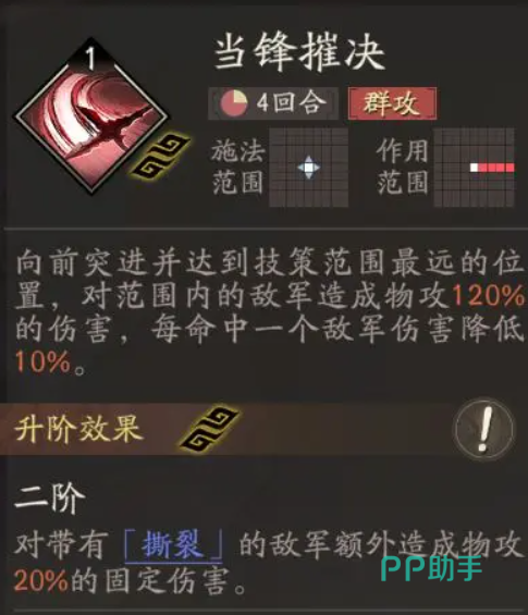 与此同时,张辽还将额外附加一层撕裂效果,使目标每回合结束时承受施法者物攻20%的真实伤害,最多可叠加至5层,且该状态会降低目标15%的兵力恢复效率。另一项重要技能具备全军突击特性,能够为范围内所有友军单位赋予破军状态,持续两个回合。此状态下,我方部队在发动主动攻击时,伤害提升15%,并获得少量移动力加成。需要注意的是,该增益不可叠加,且可能被敌方净化类技能解除。