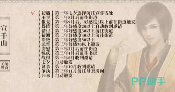 宣千山这个角色在婚前是最容易攻略的,在第三年之后与宣千山的好感和剧情任务都完成能够选择与他成亲。第一步很重要在第一年的七夕节选项中一定要选择前往宣暮雪家,不选择选项宣千山这条线就会断掉!开启这条线之后玩家就要不断的绣荷包送礼物来刷宣千山的好感度,根据图表前往地点触发相应事件,这里需要注意着第三年的时候一定要去偷听父母的话,不然直接会被送进宫直接结局!