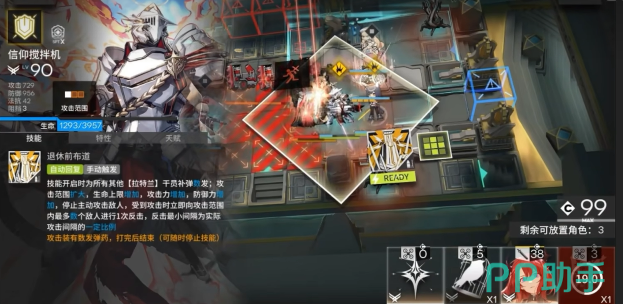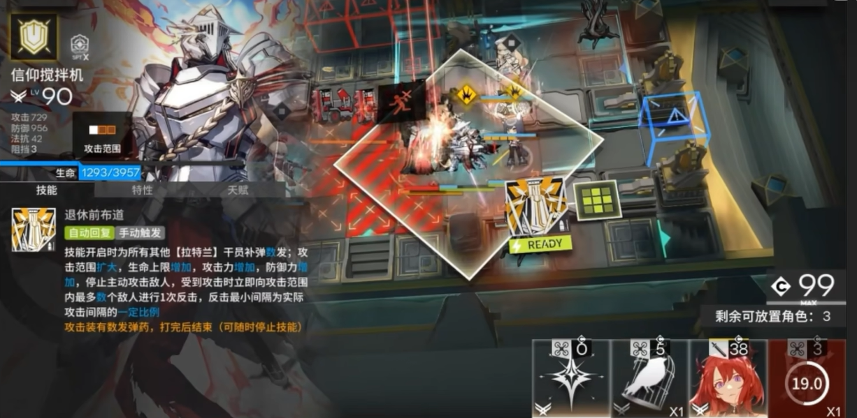 如果你觉得这还不够,三技能“退休前布道”绝对能让你眼前一亮。开启后,信仰搅拌机会为其他“拉特兰”干员提供弹药,提升他们的输出能力,同时增强自己的生命上限、攻击力和防御力。更为重要的是,技能结束时,他会自动反击敌人,这一反击的次数和伤害是基于信仰搅拌机实际攻击间隔的比例。看似简单的技能,实际在战场上却能造成巨大的影响,尤其是在面对大规模敌人时,反击造成的伤害足以改变战斗的节奏。