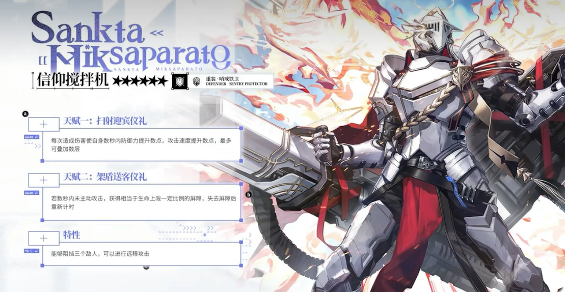 信仰搅拌机,听名字就有点意思,这可不是一位普通的重装干员,而是活动限定的六星干员之一——他就是明日方舟六周年庆推出的哨戒铁卫新星,信仰搅拌机。今天小编就带来明日方舟信仰搅拌机介绍。正如他的名字所示,这位新干员不但有着厚重的防御,还带着一股“搅动”战场的强大力量,能够在不同的情况下为队友提供强力支援。