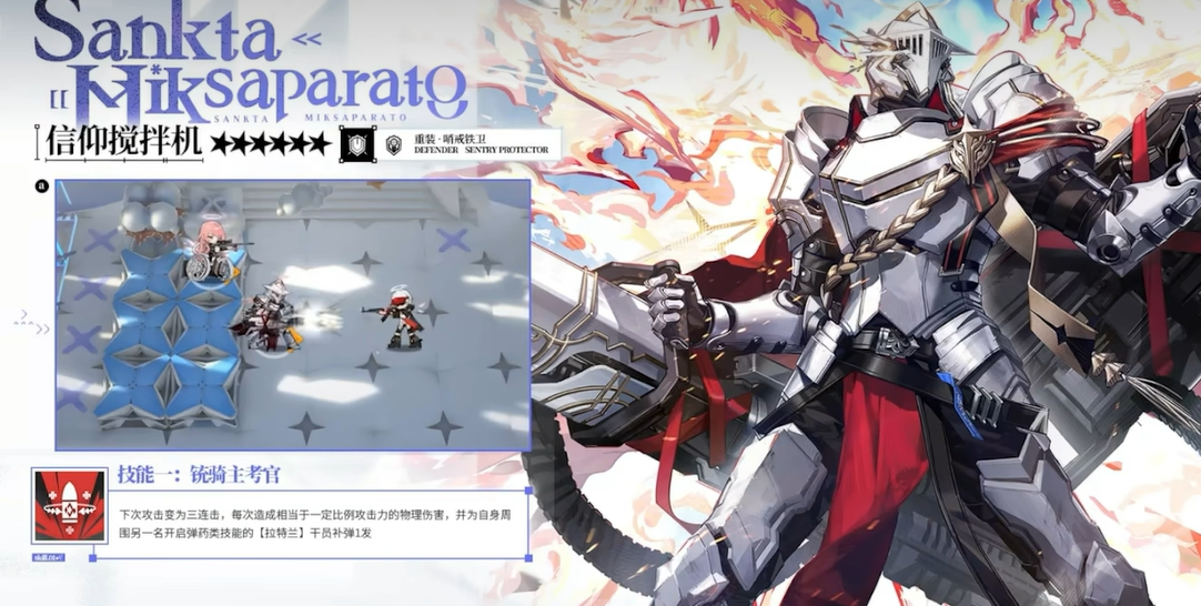 信仰搅拌机的技能更是他的亮点所在。尤其是一技能“铳骑主考官”,这技能让信仰搅拌机在攻击时变成了三连击,每次攻击造成的物理伤害都非常可观。而且,不得不提的是,他还能为周围的“拉特兰”干员提供弹药,增强他们的持续输出能力。在战斗中,如何合理运用这一技能,为你的队友提供弹药,既能提高战术效果,又能减少后勤压力,真是巧妙之选。