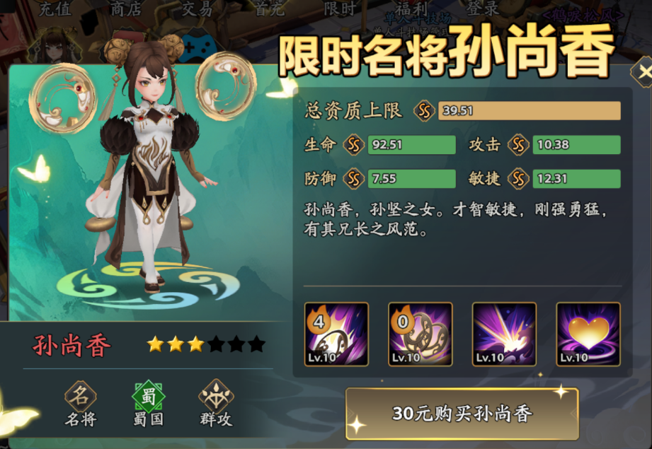 限时武将直购是另一重点付费入口。当前测试版本推出孙尚香限时折扣获取活动。该角色定位为群体输出型武将,其技能具备范围伤害特性,在推图与副本攻坚中表现突出——尤其适配“1精英+多杂兵”的常规战斗结构,能高效清场、节省回合数,大幅提升通关效率与资源产出率。