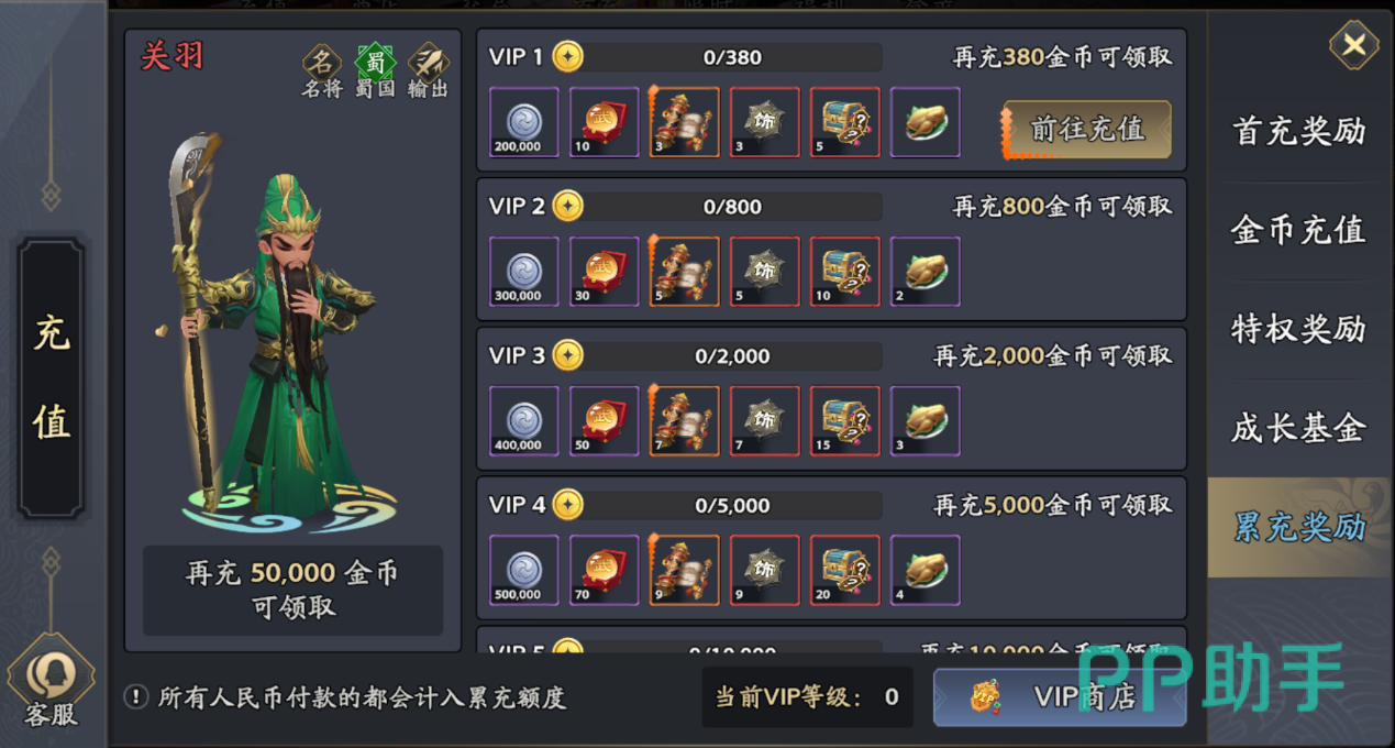 首充礼包同样具备高价值属性。首次充值即可领取S级武将诸葛亮,属阵容构建初期的核心输出兼策略辅助角色;累计充值达指定额度后还可解锁关羽,进一步补强前排生存与爆发能力。两位武将均为当前版本T0梯队成员,成长曲线优秀,资源倾斜回报明确,属于推荐优先解锁并长期培养的对象。