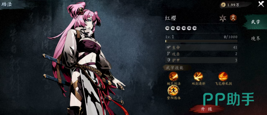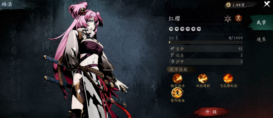 接下来介绍的是红樱,一位擅长剑法输出的高爆发角色。她在装备武器状态下拥有极强的攻击效能,每次命中可触发三次、每次10%的附加伤害。若使用双剑作为主武器,其实战威力将达到峰值。当连续五次成功命中目标后,将激活“缭乱斩”技能,再次发起一次追加攻击。配合“飞花缭乱剑”这一强化技,可使缭乱斩的伤害提升50%,大幅增强连招衔接下的输出节奏。尽管炼体成长提升了攻击上限,但生命值成长相对较低,需注意站位保护。