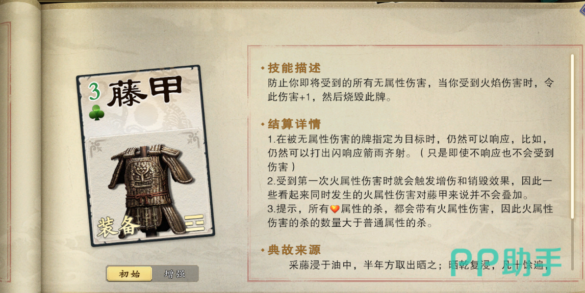 防具主要用于提升角色的存活率,降低受到的伤害频率与强度。八卦盾可通过判定实现伤害抵消或体力回复,具备极强的持续作战能力,无论用于抵挡致命一击还是逆转残血局势,均表现优异。藤甲可完全抵御无属性伤害,对于常规【杀】具有显著防护作用,但无法防御如【火杀】等带有火焰属性的攻击,因此在对阵擅长火系技能的对手时需谨慎选用。