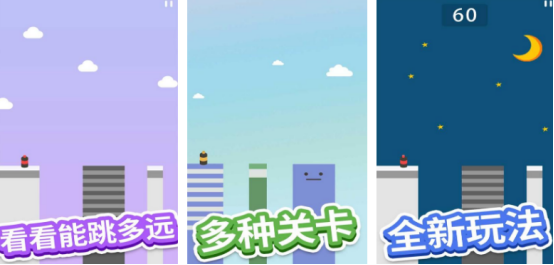 卡通的人物形象等待玩家操控,通过跳跃的方式顺利跳跃到下一个平台当中,简约的画面以及简单的操作方式让很多玩家沉浸于其中,可以通过点击屏幕并按住屏幕的方式来序列。蓄力的时间越久跳越的就会越远,但是玩家要根据两块方块之间的距离进行蓄力。