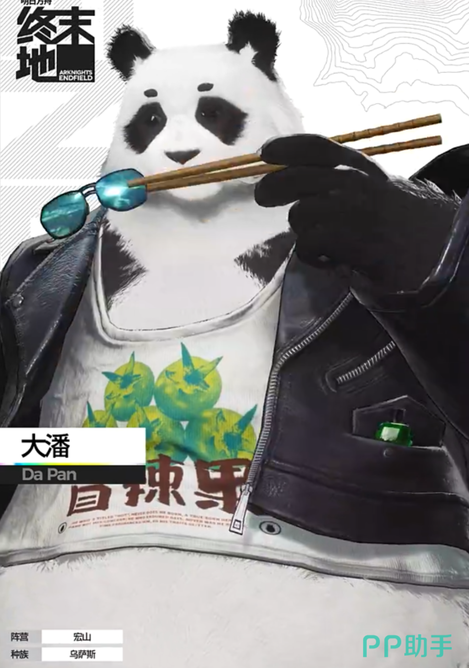 明日方舟终末地熊猫,其实就是大潘,他是具备特色的,很多玩家对大盘这个角色迫切的想要了解。要说他作为一只形象十分的帅气又憨态可掬的熊猫,戴着酷酷的墨镜,后背还有一口大锅。下面就重点给玩家分享熊猫大潘的相关内容,让玩家对大潘这个角色更加深入的了解。