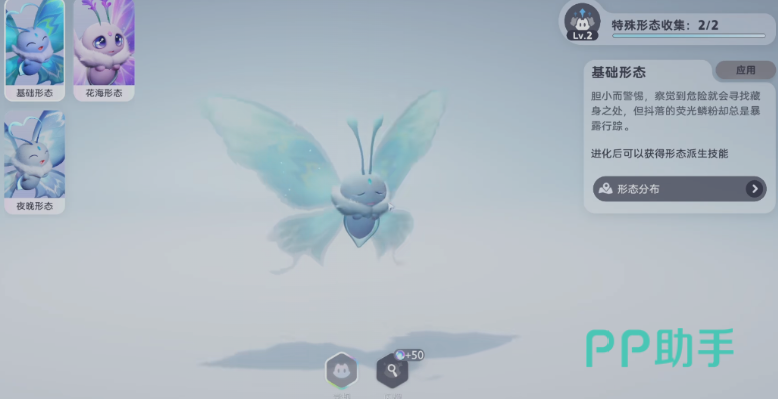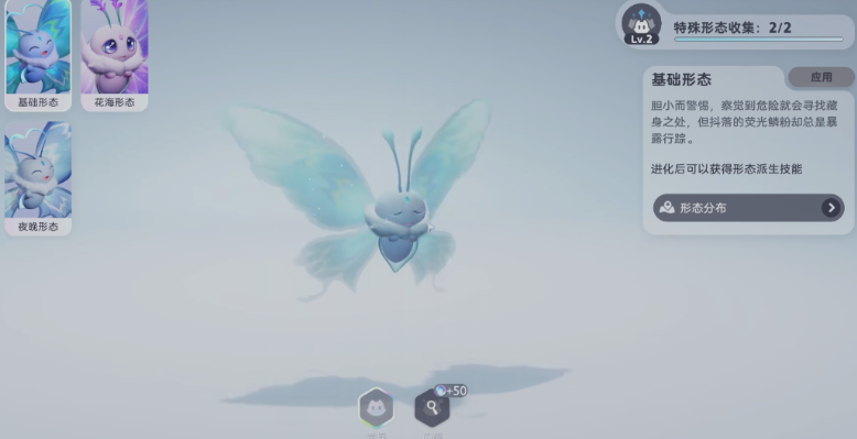 此外还有一种仅在夜晚出现的特殊形态,其翅膀上的荧光由蓝转为淡蓝,并伴随闪烁的光影轨迹,视觉效果尤为突出。每种形态都有对应的触发条件:花海形态需在花海区域起风时才可能现身,而夜行形态则必须将游戏时间调整至晚间方可遇见。这些特定环境要求也直接影响后续的研究项目解锁路径。