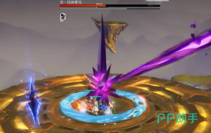 “时空的终焉”作为全屏高伤技能,具有明显的蓄力前摇。爆炸中心会造成高额伤害及击飞效果,但可通过站位巧妙规避。推荐站于左右两侧空岛正下方,爆炸冲击会将角色推送至空中平台,既避开主要伤害区,又能维持稳定输出。