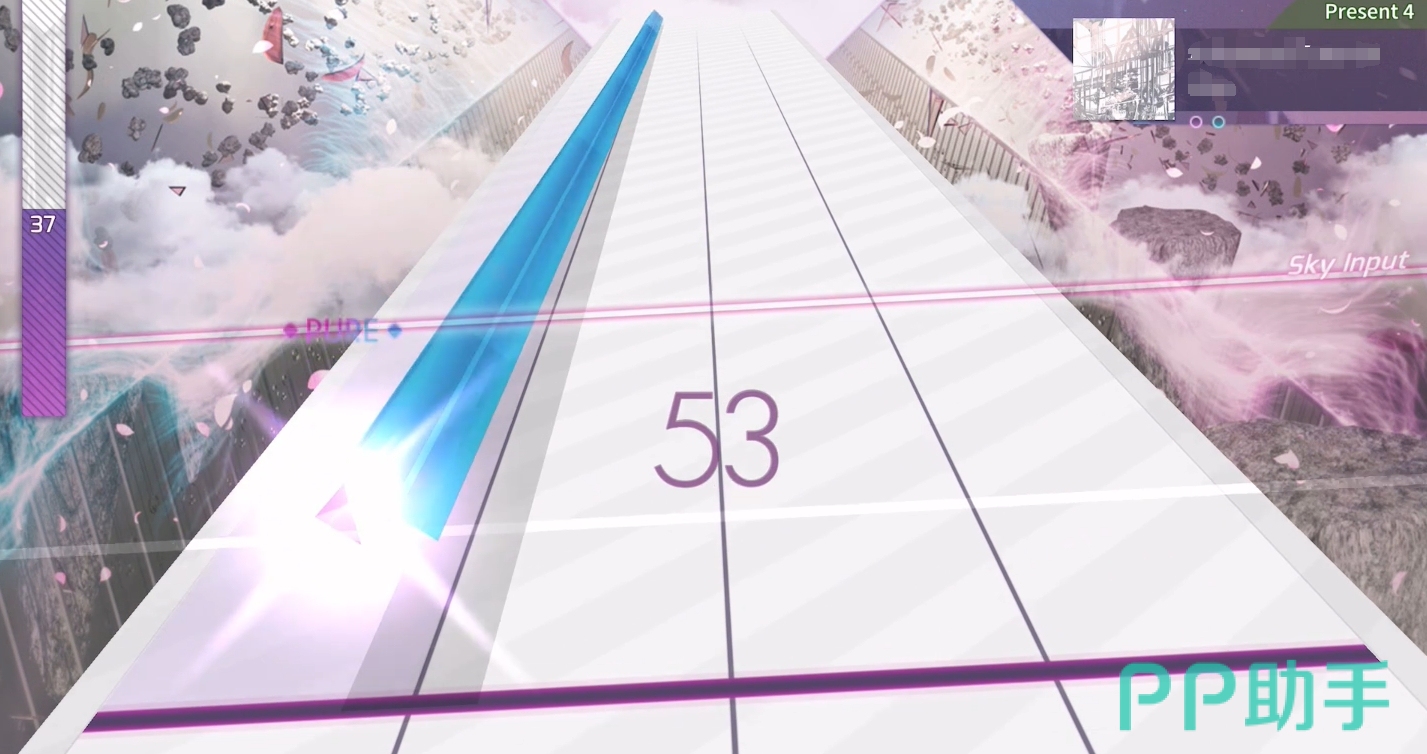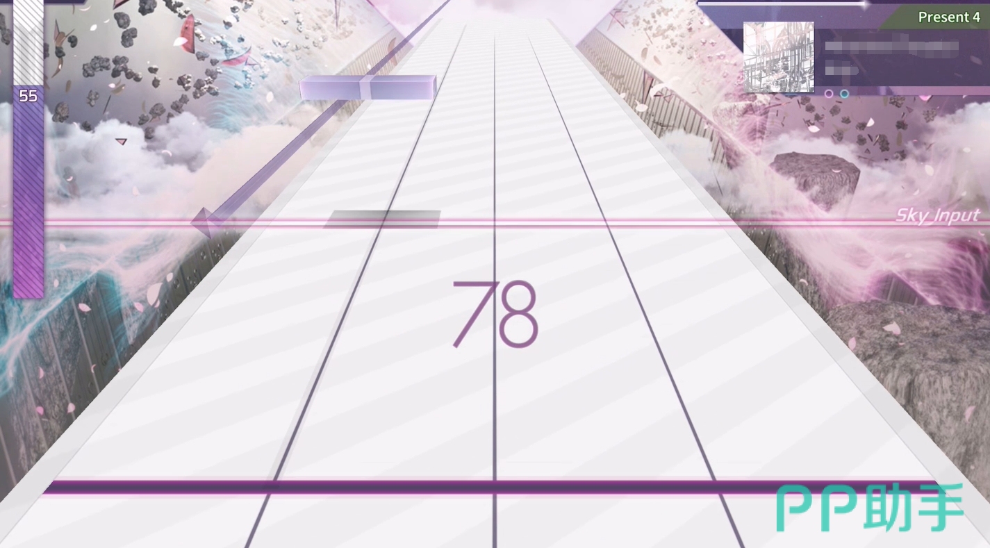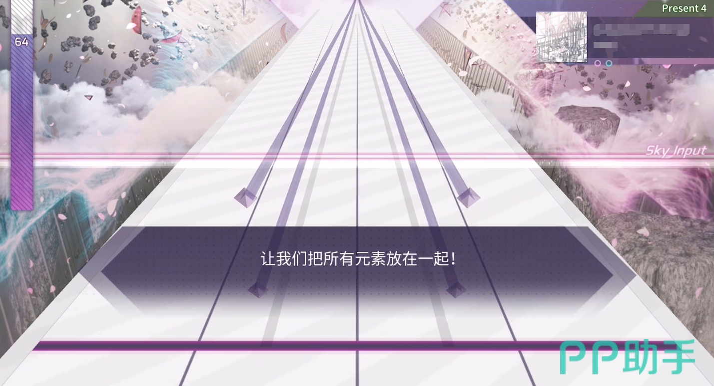 第二个部分有两种新音符元素,一是粗壮的音弧转变成为细长的音轨,且音轨并没有判定要求,当发生转化时玩家只需将手指移开不与屏幕接触即可,但要确保在音弧尾部全部判定完后才移开,否则也会漏掉判定。第二张新音符为天空音符,它只会在音轨上生成,各位可在它到达判定线后,通过点击判定的方式来完成判定,生成多个天空音轨时需连续点按。随着音轨的方向改变,天空音符生成的方向也会随之发生变化,只要多注意音轨的变化玩家就不容易将天空音符错过。