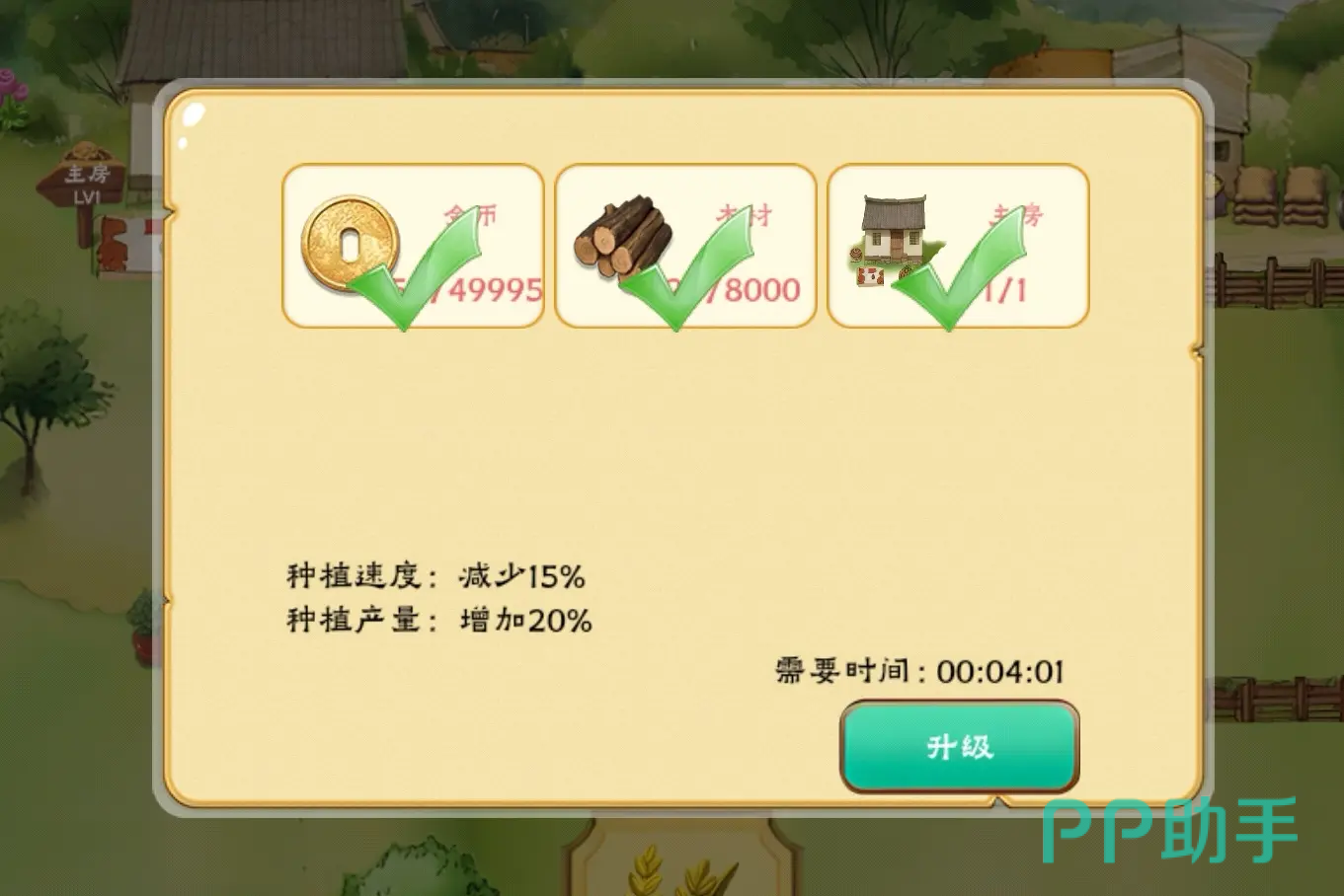 随着进度推进,玩家需持续拓展种植规模。土地升级是提升产出效率的关键路径,每次升级均需消耗金币与木材;同时主屋等级也需同步提升,二者协同作用,可显著增加单次收获量及可种植作物种类上限。升级完成后,作物生长周期稳定、产量提升明显,日常管理趋于自动化。