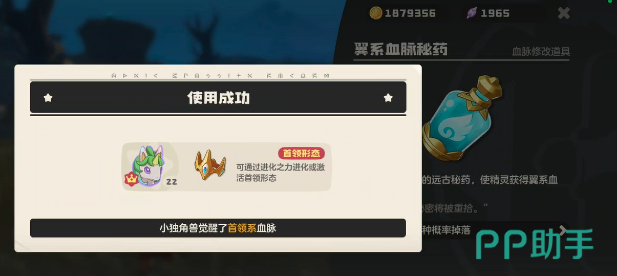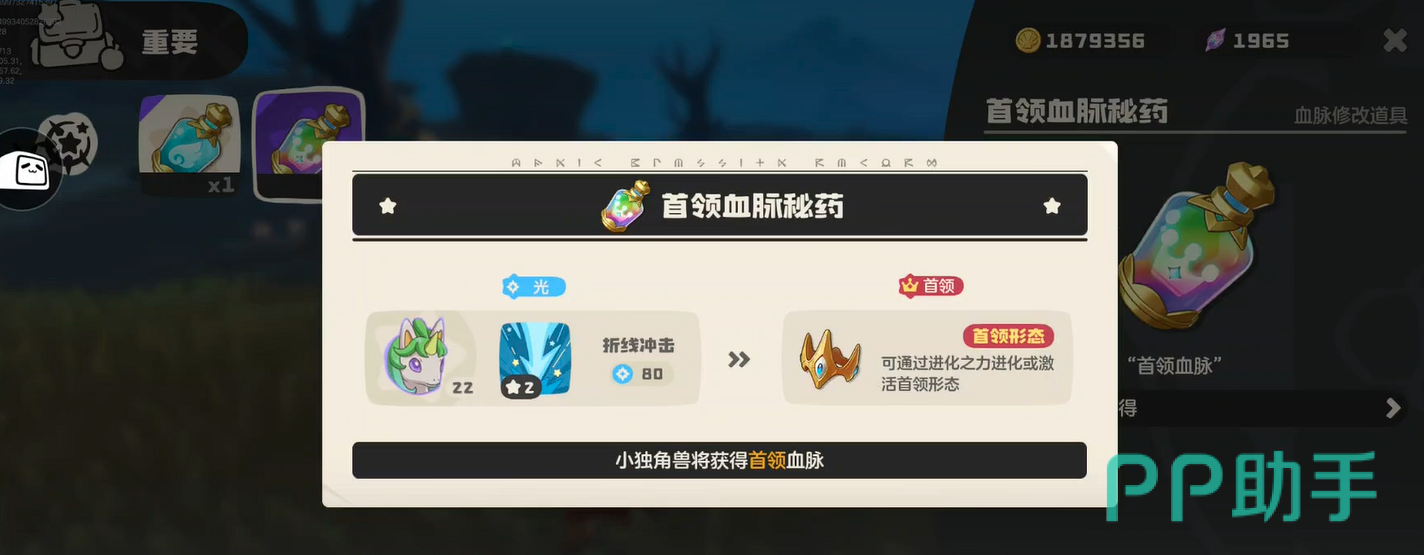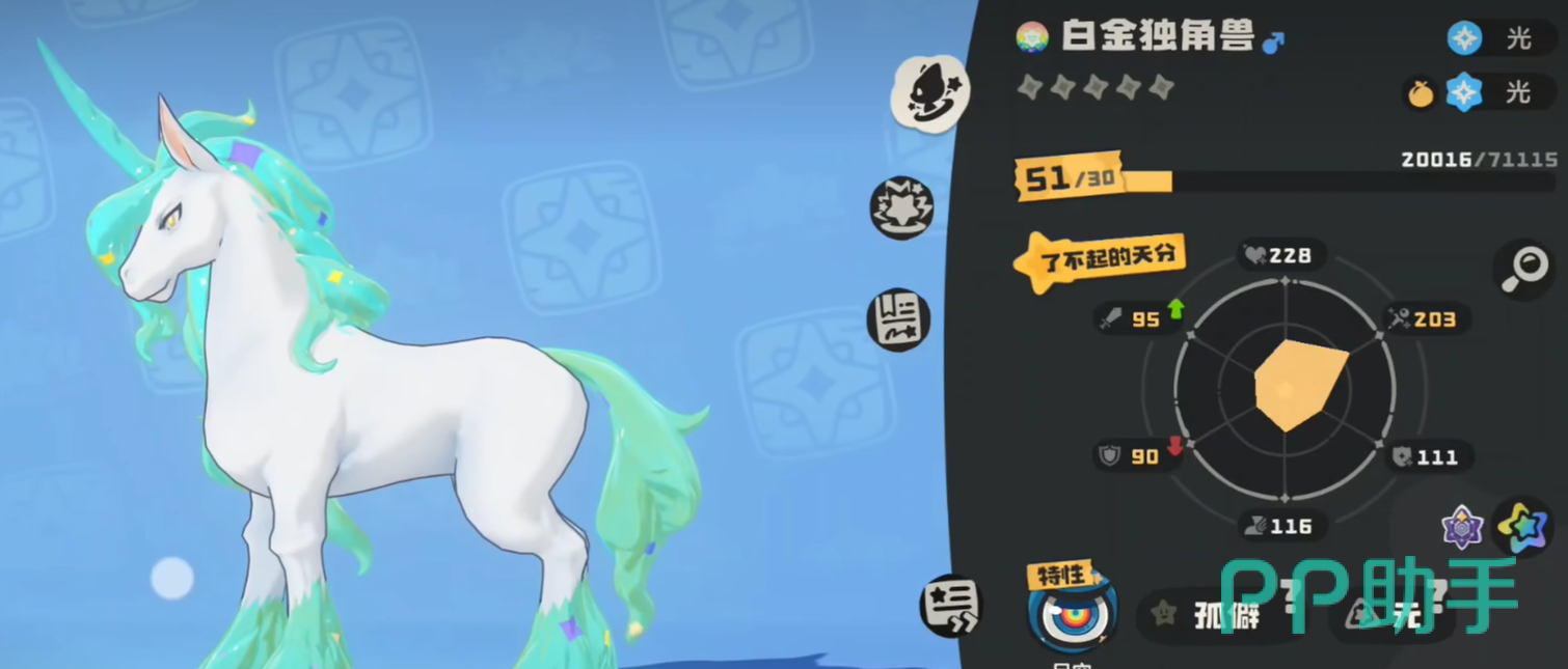 获取该精灵需以白金独角兽为进化基础。白金独角兽须通过常规驯化流程加入队伍,并完成基础培养后方可进入进阶阶段。但仅拥有该宠并不足以触发转化——必须同步满足两项刚性条件:一是习得“进化之力”,二是携带“首领血脉”。二者缺一不可,且须在同一精灵个体上共存。