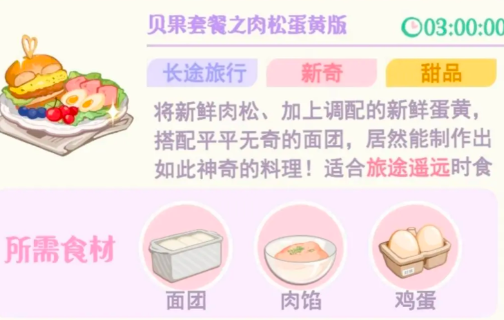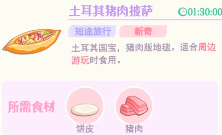 这个角色除了喜欢这种常规的素食之外,还对于各种新奇的菜品很感兴趣,在周边旅行的时候,角色会选择饼皮和猪肉制作的土耳其猪肉披萨,这个披萨的外观比较独特,像一个硕大的开,这个角色会选择芝士培根三角包,还会选择贝果套餐之肉松蛋黄版,两个都是比较新奇的菜品,玩家需要准备面包,培根芝士,另外还有面团,肉馅,鸡蛋,这样通过组合就能制作出这两道菜品。