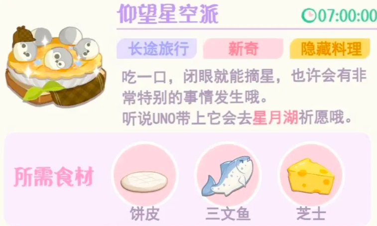 除了常规的菜品之外,这个角色还比较喜欢仰望星空派,需要饼皮,芝士三文鱼进行搭配,是一个造型非常奇特的食材。