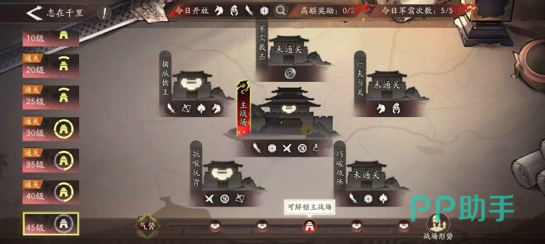 当前“志在千里”已开放至50级战场,内容庞大且策略性强。由于篇幅所限,本文聚焦于高难度节点——第45级颜良文丑之战。首先需要明确该模式的基本结构:每一大关由五个分战场与一个主战场构成。当玩家成功攻克任意三个分战场后,即可解锁主战场入口。特别提示:若在开启主战场后继续完成剩余分战场任务,系统将自动下调主战场的战斗难度。因此推荐优先清空全部五个分战场,再集中精力挑战主战场以实现资源最大化收益。