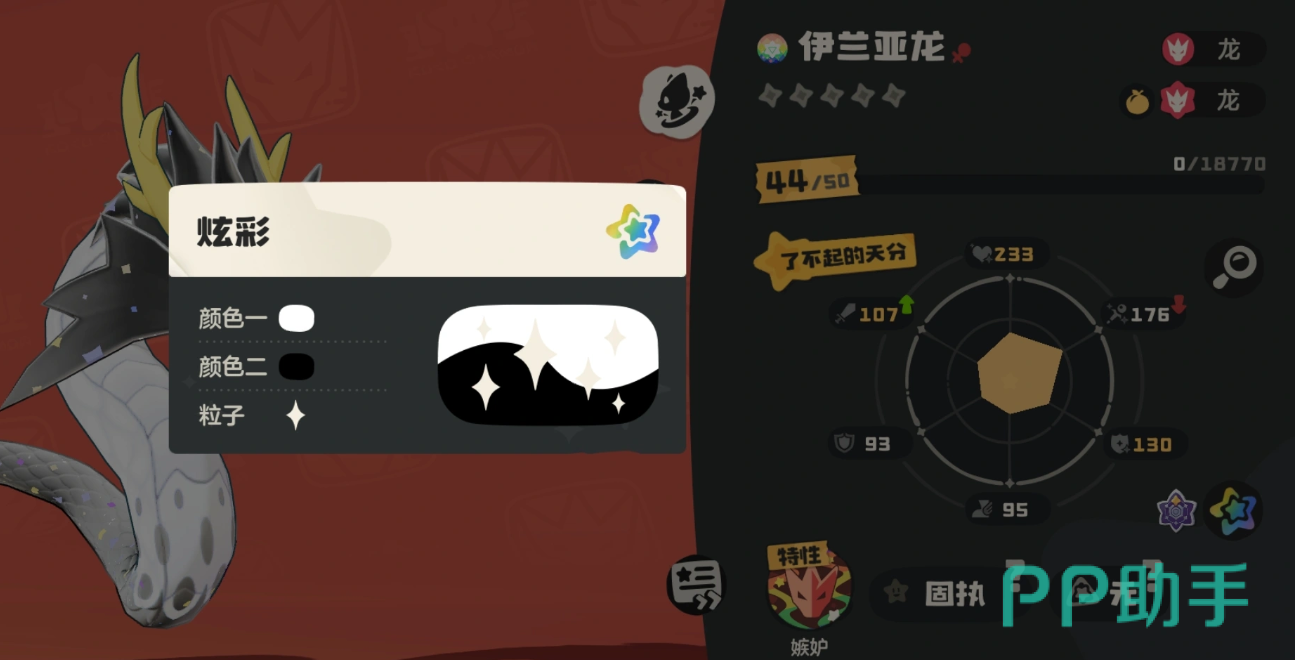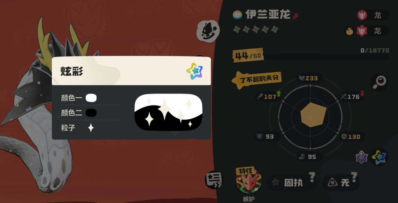 该精灵由伊雷龙进化获得,属性为纯龙系。核心特性为【嫉妒】——当处于蓄力状态时,可无视PP限制,任意释放已习得技能。基础能力值方面,魔攻高达190点,是当前版本中顶尖的魔法输出面板;物攻则为91点,定位明确偏向法术爆发流派。