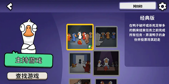13人进阶场面向熟练玩家设计,阵营结构与8人场一致,但人数增加显著提升了信息干扰度与行为复杂度。角色技能更具差异化,例如部分鸭子具备伪装能力,某些鹅拥有视野限制类被动,中立角色目标进一步细分——有的需淘汰指定对象,有的则必须存活至倒计时结束。轮抽玩法在此模式中尤为突出:开局每人抽取三张角色卡,可任选其一;若放弃,则从公共池中随机获得身份。这种机制大幅增强单局不可预测性,考验玩家对角色池的熟悉程度与临场取舍能力。