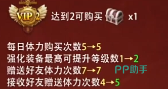 VIP1至VIP2为入门进阶阶段,累计需充值42元。达成后解锁VIP专属礼包体系,包含每日可领礼包与每周限定礼包,内容涵盖通用强化材料、金币及少量稀有道具,满足前期角色培养的基本需求。