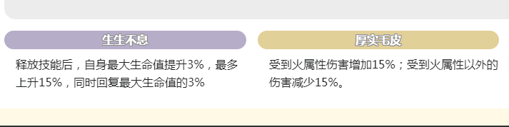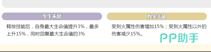 在被动技能方面,“生生不息”能够在每次释放技能后提升自身3%的最大生命值,最多叠加至15%,极大增强了持续作战能力。“厚实毛皮”具有双面特性:面对火属性攻击时会额外承受15%伤害,但对其他所有属性伤害均减免15%,合理规避火系对手时,生存能力大幅提升。“亢奋”是一项强力团队辅助技能,使用后使队伍内所有角色获得50%的伤害提升,虽然无法叠加,但在关键战斗中能发挥决定性作用。
