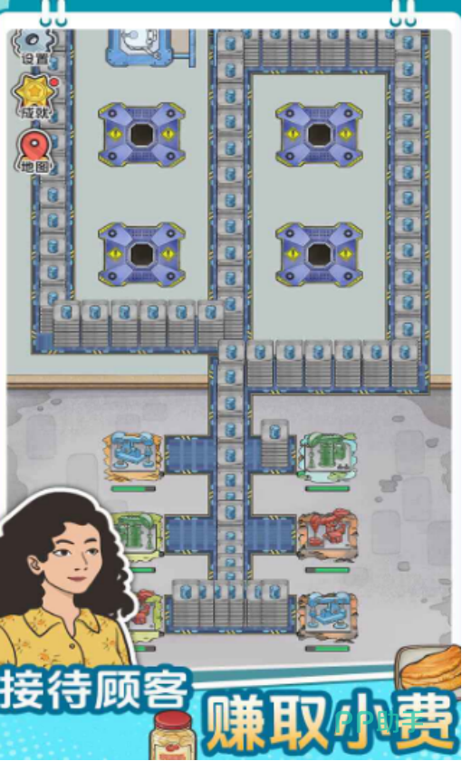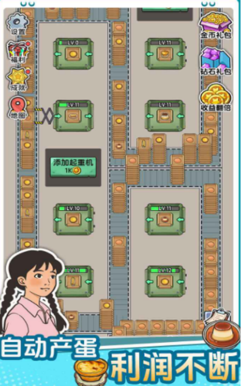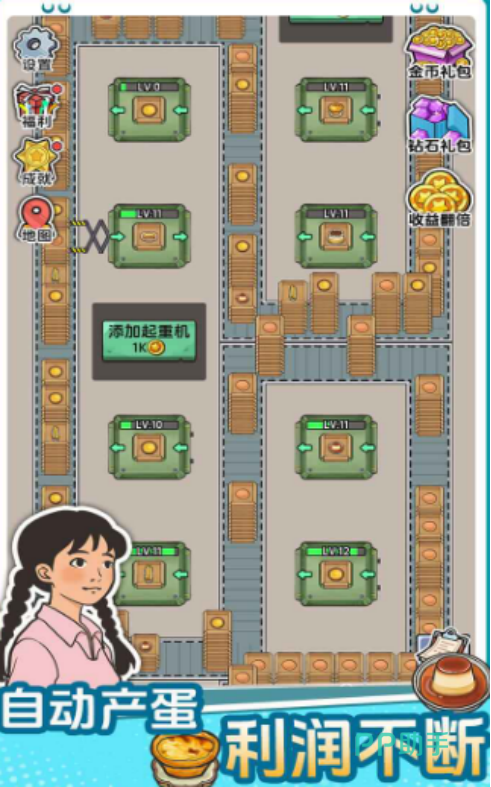 离线收益机制是本作重要特色之一:即使关闭游戏,产线仍可持续运行并积累金币与资源,登录后即可一键领取。同时,设备升级系统深度影响整体效率——提升母鸡产蛋频率、缩短加工周期、增强传送带运载量等关键参数,均需通过金币投入持续迭代,形成“建设—产出—升级—扩张”的正向循环。