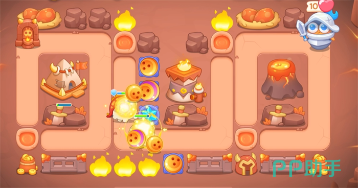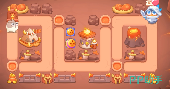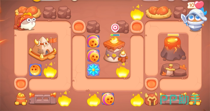玩家需要在游戏开始时迅速建立瓶子炮和冰锥塔,瓶子炮的首要任务是锁定并摧毁左侧的恐龙蛋窝,这是通关的关键。一旦恐龙蛋窝被摧毁,玩家应立即在该位置建立新的瓶子炮,以便清理下方的火山区域。