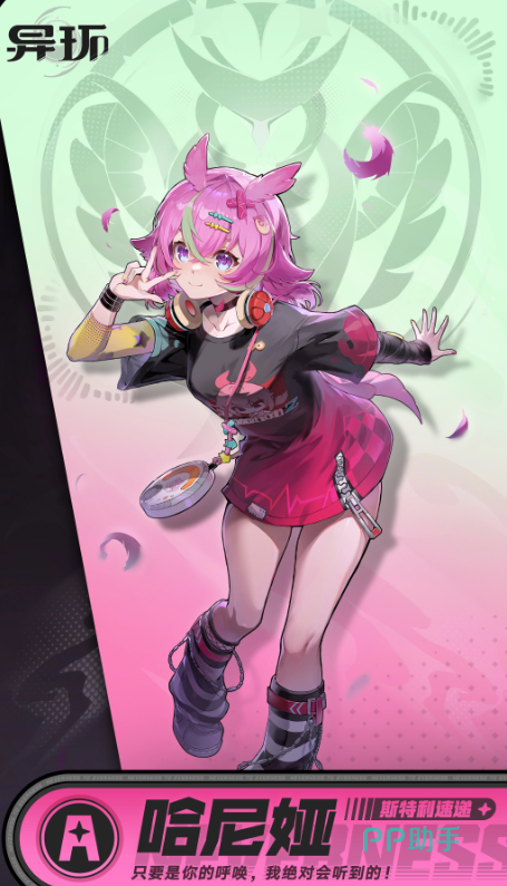 哈尼娅是《异环》中定位为A级的战术支援型角色,隶属情报组织“斯特利速递”。其视觉设计极具辨识度:柔亮的粉紫色长发、形似猫头鹰耳羽的立体饰羽,以及始终佩戴的通讯耳机,共同强化了她作为前线情报节点的专业形象。依据组织职能设定,她主要承担敌情侦测、实时通讯中继与战术协同等关键任务。