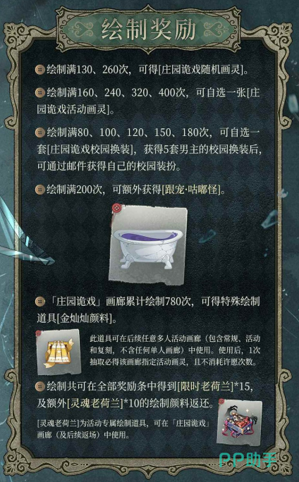 这次的活动卡池引入了“许愿”功能,极大地提升了抽卡的确定性和奖励的丰厚程度。在绘制达到130次和260次时,玩家将获得一张随机的庄园诡戏活动SSR画灵。而在绘制累计达到160、240、320、400次时,可以自选任意一张心仪的活动SSR,进一步提升获取目标卡片的效率。此外,抽卡过程中也能获得一系列换装奖励:绘制达到80、100、120、150、180次时,会分别解锁对应男主的校园换装,集齐五套之后,玩家还能通过邮件获得属于自己的校园装扮。