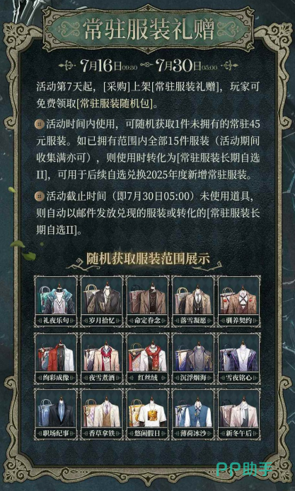 从7月16日09:30起,游戏内还将上架常驻服装礼包,玩家可以免费领取一份“常驻服装随机包”,为角色的外观搭配增添更多可能。此外,活动期间还会推出包括预热礼包、推送礼包和特别礼包在内的多种礼包,玩家可在游戏内详细查看并酌情获取。