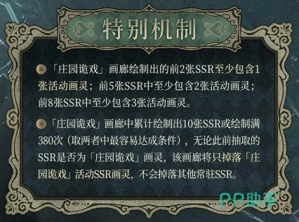 卡池还设有特殊掉落机制,进一步优化玩家的抽卡体验。在前2张SSR中,至少包含1张活动画灵。前5张SSR中,至少包含2张活动画灵。前8张SSR中,至少包含3张活动画灵。与此同时,若玩家已累计抽取10张SSR,或总抽卡数达到380次(取最早满足的条件),之后在该画廊中获得的SSR将只包含本次“庄园诡戏”活动的SSR画灵,常驻SSR将不再掉落,这一设定对长期抽卡和保底玩家来说尤为友好。