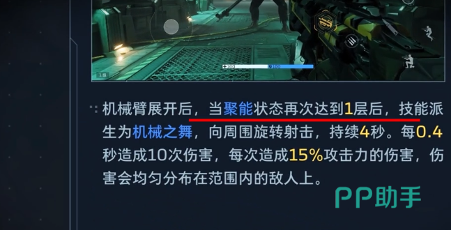 “机械之舞”的核心机制为聚能旋转射击:开启后自动展开机械臂并进入能量累积阶段,随后触发高速旋转射击状态。在此状态下,攻击频率稳定维持在每0.4秒一次完整循环,每次循环产生10段独立伤害判定,每段造成15%基础攻击力,等效为每秒完成10次有效命中。此外,在技能倒计时归零前的最后瞬间,将激活“完美谢幕”效果,集中释放积蓄能量,形成单次高额爆发伤害,对残血目标及小规模集群敌人具备极强的终结能力。
