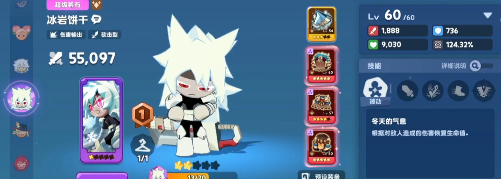 冰岩饼干定位为土系超级稀有输出单位,满级60级时拥有1888点攻击力和124.32%的属性加成,表现十分突出。然而其生存能力较弱,仅有736防御力与9030生命值,属于典型的脆皮高伤类型。因此队伍中必须配备治疗型角色来维持其持续作战能力。其核心技能“极限酷寒”是主要输出爆发手段,施放后可冻结大范围敌人,能量需通过普通攻击积攒,技能释放稳定不易空放。在冻结状态下,普攻会转化为多段冰刃斩击,且第三次普攻附带小范围AOE伤害,清理杂兵效率极高。实战中建议保持走位拉怪,尽可能冻结更多目标以提升清场效率。技能升级优先考虑延长冰冻持续时间及增加普攻段数,先用小技能聚怪再开启大招,能显著提高整体输出节奏。