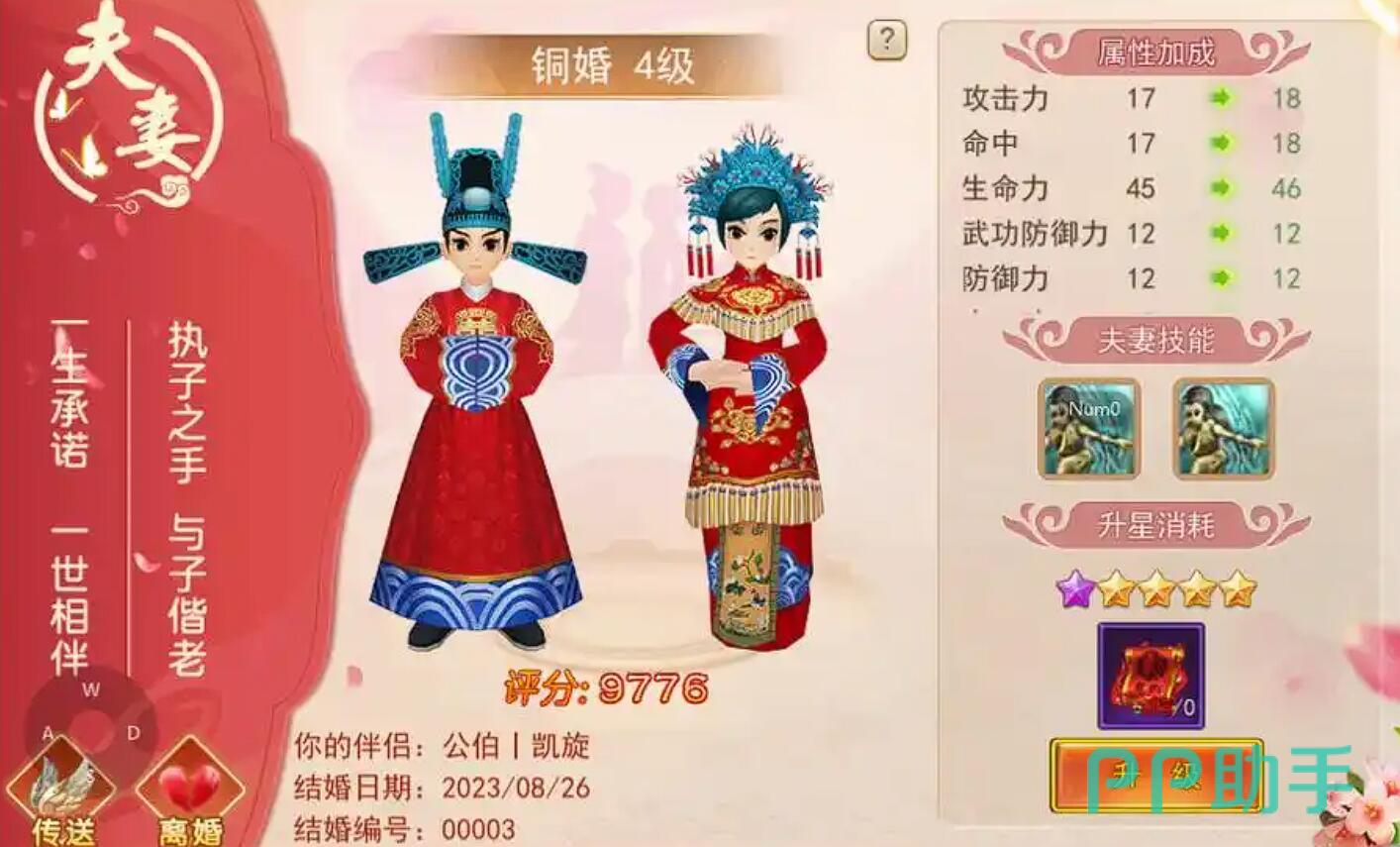 结为夫妻后,可解锁两大实用技能:铜钱传送与复活伴侣。技能最高等级为10级,具体上限受姻缘等级制约,需达到对应姻缘等级才能逐步提升。同时,夫妻双方将共同获得攻击、防御、生命三项基础属性加成,随着姻缘等级提升,每级增加5点攻击、3点防御、20点生命值,满级累计提升50攻击、30防御、200生命。日常可通过夫妻组队在同一场景接取姻缘任务(例如共同击败怪物、采集同心草),完成后积累姻缘xp,自动推进姻缘等级成长。