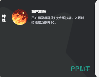 先对其基本属性进行一下分析和了解,其生命值高达100,速度高达120,物防、魔防表现较差,知道了角色的弱点,在技能搭配上就可以解锁更多思路。它的高速与特性相联动是可以实现以弱胜强的特性,蒸汽膨胀能够使攻击力翻倍,己方精灵每释放一次火系技能,入场时技能威力可提升10,所以目前适合该角色的有两大流派,一个是物理压制流,另一个是魔法爆发流。