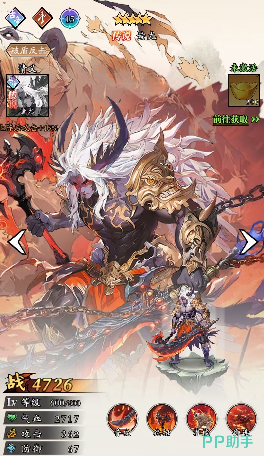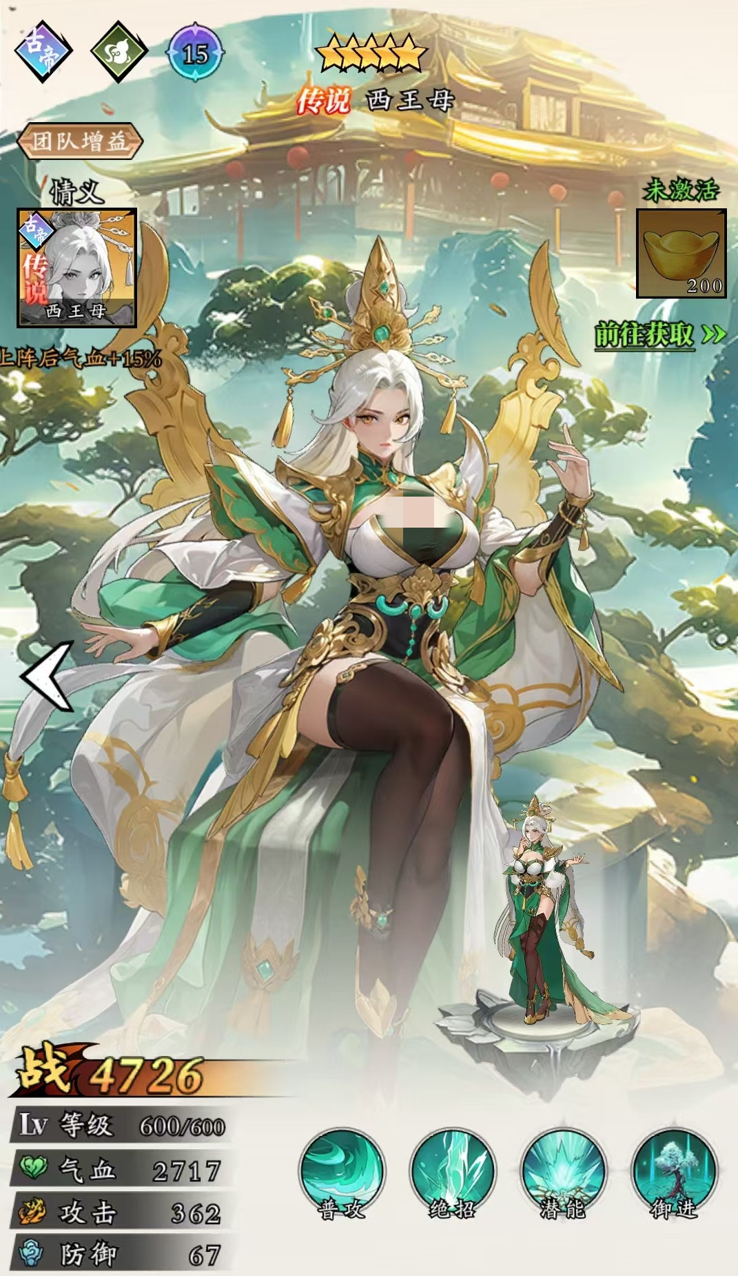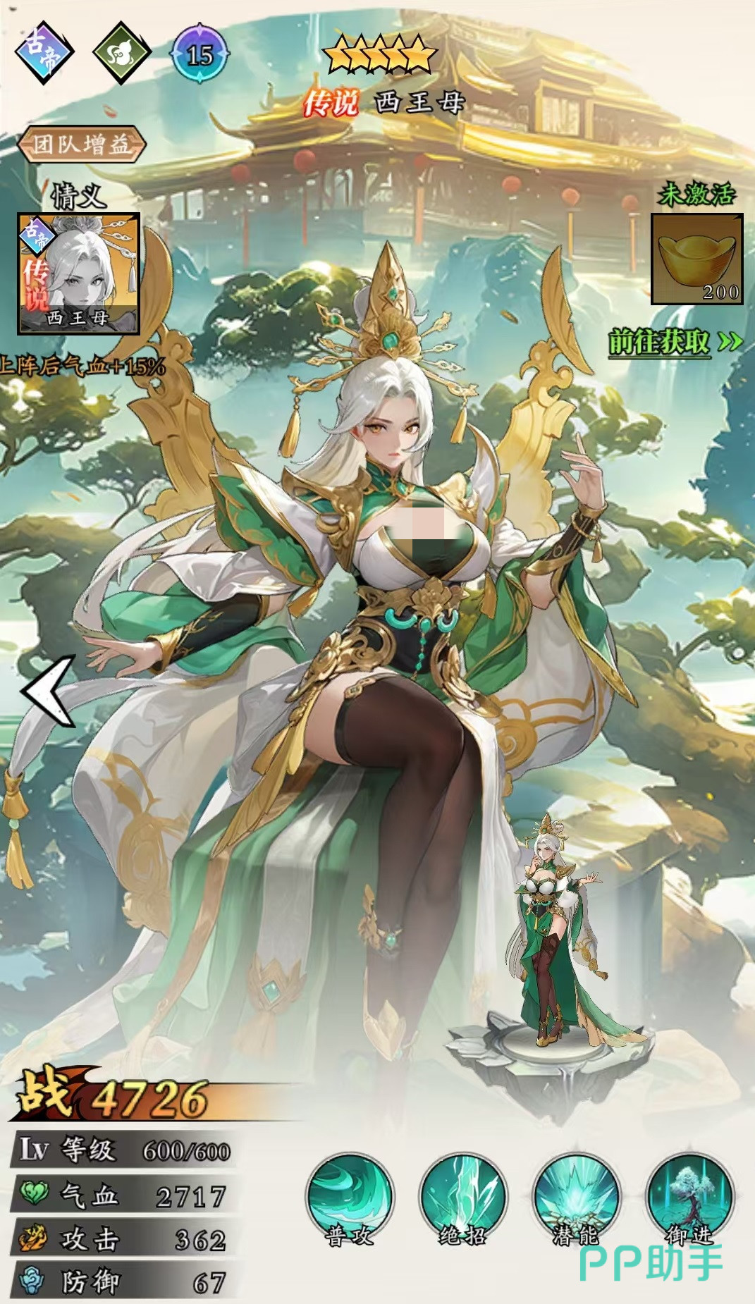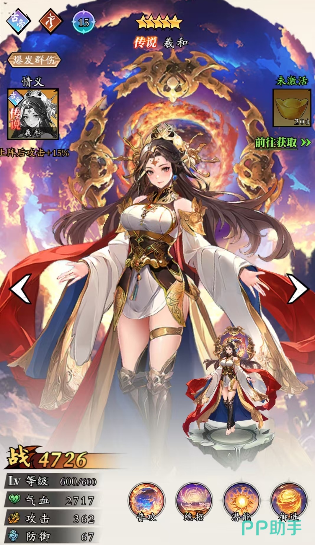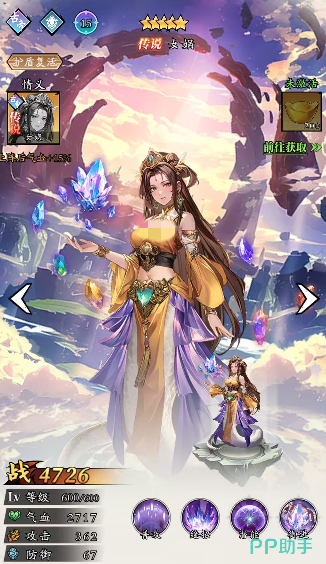 先看后排三人中的女娲,她是一位兼具保护与净化功能的核心辅助。她的绝技可对敌方全体造成伤害,并有机会清除我方所有单位所受的减益状态,成功清除后还能使我方获得20%的伤害减免加成。当星级达到十一星后,释放技能时还能为血量最低的一名队友附加无敌护盾,极大提升关键人物的存活率。