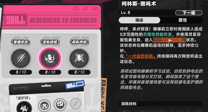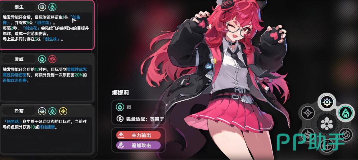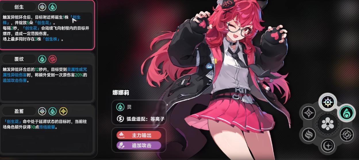 被动机制紧密围绕「异能环合」系统展开。作为灵属性角色,娜娜莉可与咒属性或光属性角色组成双核反应体系:搭配咒属性时,QTE触发后12秒内,敌人受灵/咒属性伤害时额外承受20%追加伤害,适配持续站场输出;搭配光属性则生成创生株与创生花,虽当前创生花单体伤害偏低,但在清杂场景中仍有实用价值。另一关键被动为——强化状态下,只要队伍中任一角色触发一次异能环合,娜娜莉即对当前目标追加一次普攻,使多角色协同下的输出频次与总伤显著提升。