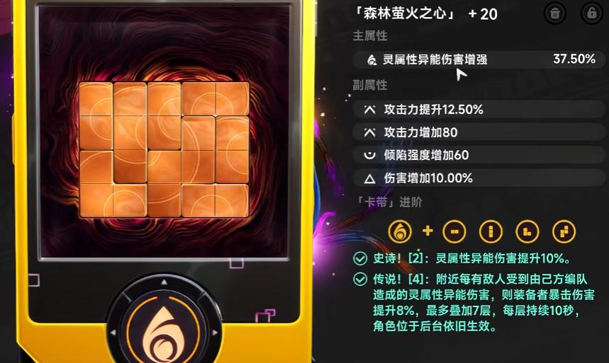 弧盘(专武)为娜娜莉提供关键战力跃升:除基础数值加成外,还可解锁主动R技能——需先以E技能获取左虎符印记,再以Q技能获取右虎符印记,双印记齐备后释放R技能生成司令虎符,对Boss类目标具有显著压制效果。替代方案中,“鲸之歌”(世界Boss掉落)与月卡武器综合强度可达专武的80%,属高性价比过渡选择。命座(觉醒)支持自主选择激活顺序:1链侧重输出增幅,6链强化大世界探索体验。卡带推荐「森林萤火之心」,属性契合度最优,可最大化技能循环收益。