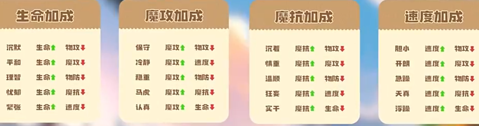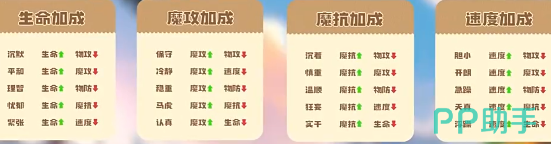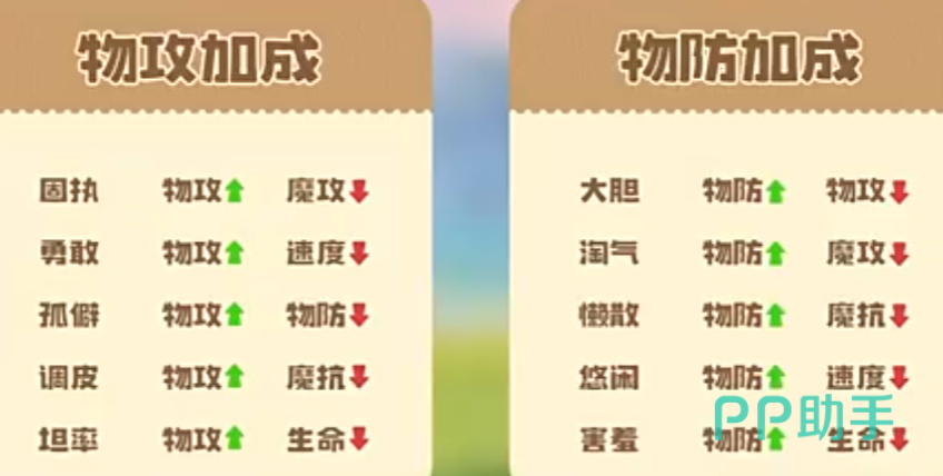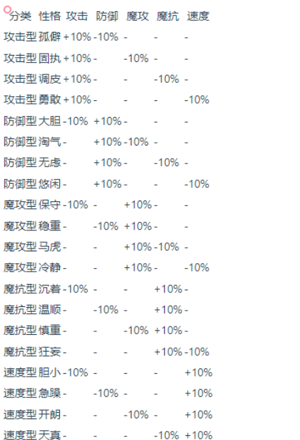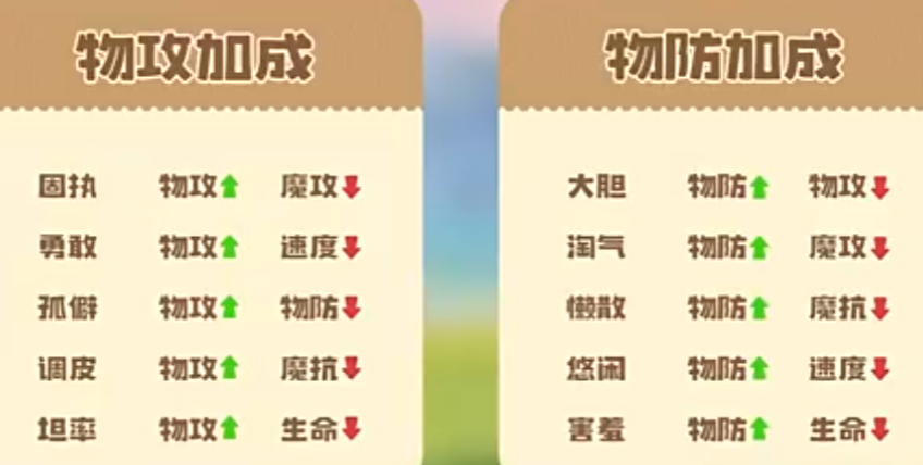 性格对六维能力的影响具有确定性,完整数值映射详见上方图表。核心选择原则为:使性格加成方向与精灵主力输出类型高度匹配。例如,勇敢性格+10%物理攻击力/-10%速度,适用于高耐久、低速但爆发极强的物攻型精灵;孤僻性格同为+10%物攻/-10%物理防御,适合应对以魔法攻击为主的对手阵容;调皮性格则强化物攻但削弱魔法抗性,需规避高频魔伤环境。