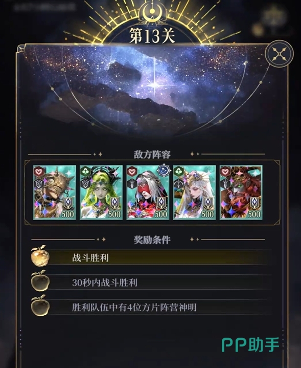 此玩法对玩家的神明储备要求较高,尤其当各关卡对特定阵营人数有明确限制时,只有拥有充足的神明资源,才能更高效地完成多星目标。当前较为通用的阵容配置为“两盾一输出两辅助”,其中一名辅助必须具备治疗与护盾能力,以保障团队续航。在前排选择上,若需满足阵营人数要求,可安排两名同阵营的防御型神明出战;主C则依据星级任务灵活调整——如需优先击杀敌方后排,则选用夜神这类刺客型角色,否则可以上站桩输出稳定打伤害。辅助位建议固定携带能量回复类角色财神,若有其他功能性更强的选择也可替换。