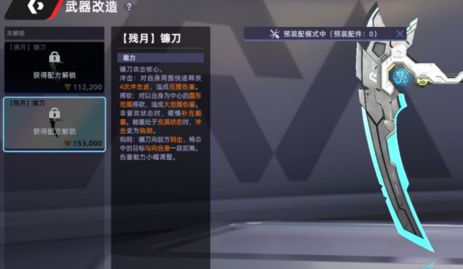 镰刀支持深度改造系统,通过装配特定部件可解锁进阶能力。改造后每次攻击将附带冲击波效果,并生成半径1.8米的圆形溅射判定区,区域内所有目标均承受45点额外伤害。非战斗状态下,镰刀能量每秒自动恢复3.5点,满能(100点)时激活“疾影突刺”技能:向前直线位移3.2米,命中后触发反向钩拉效果,将目标拖拽至使用者身前1.5米范围内,为队友创造集火窗口。