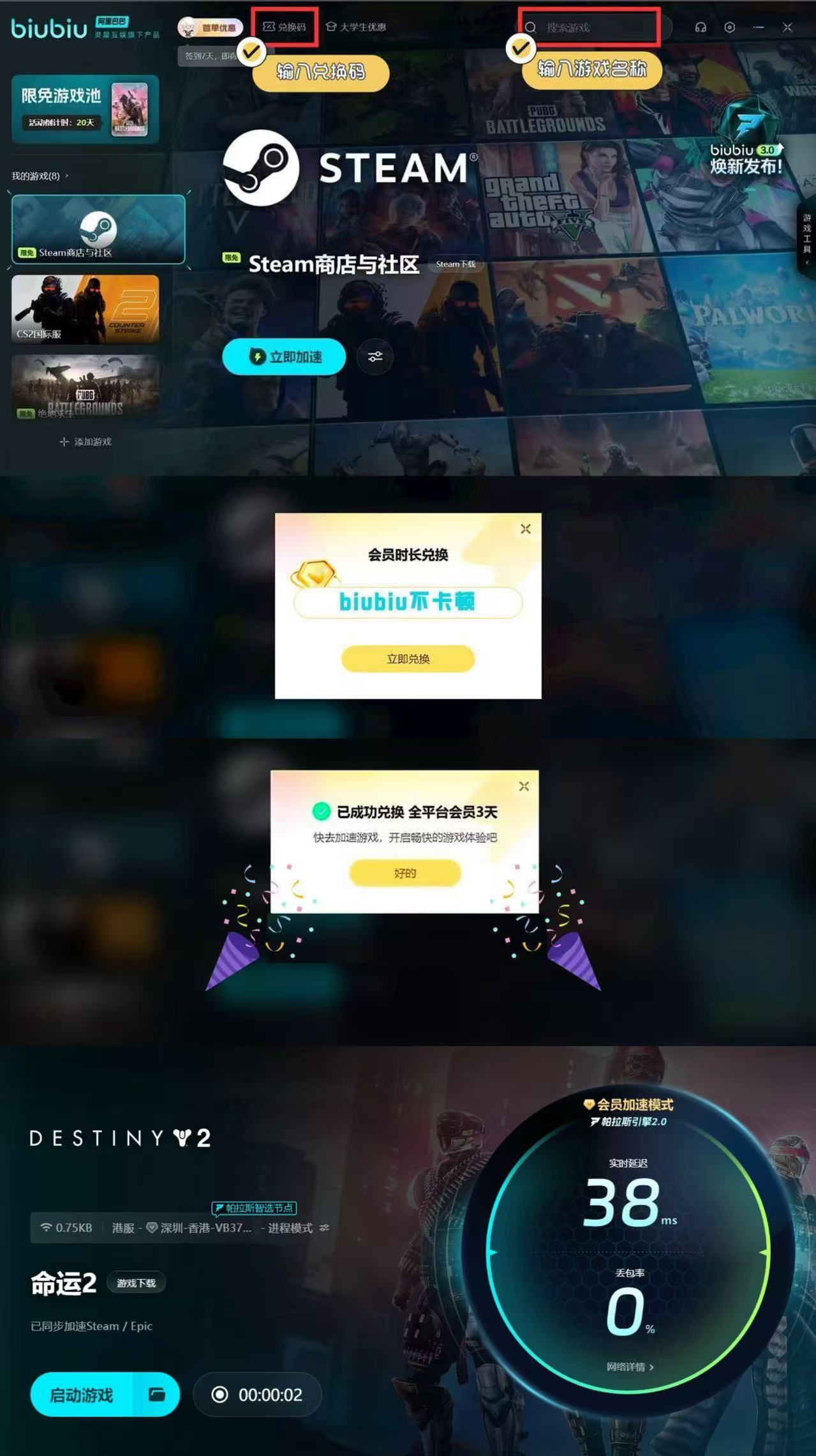想要体验biubiu的话,可以使用加速器推出免费加速福利活动。比如说新用户在注册和登陆后可以直接获得3h的加速,利用“biubiu不卡顿”这个口令可以获得3天的加速。如果说玩家还是在校大学生或者研究生的话,可以利用学信网证件号通过学生认证,然后享受一次超低折扣的加速器VIP充值活动。