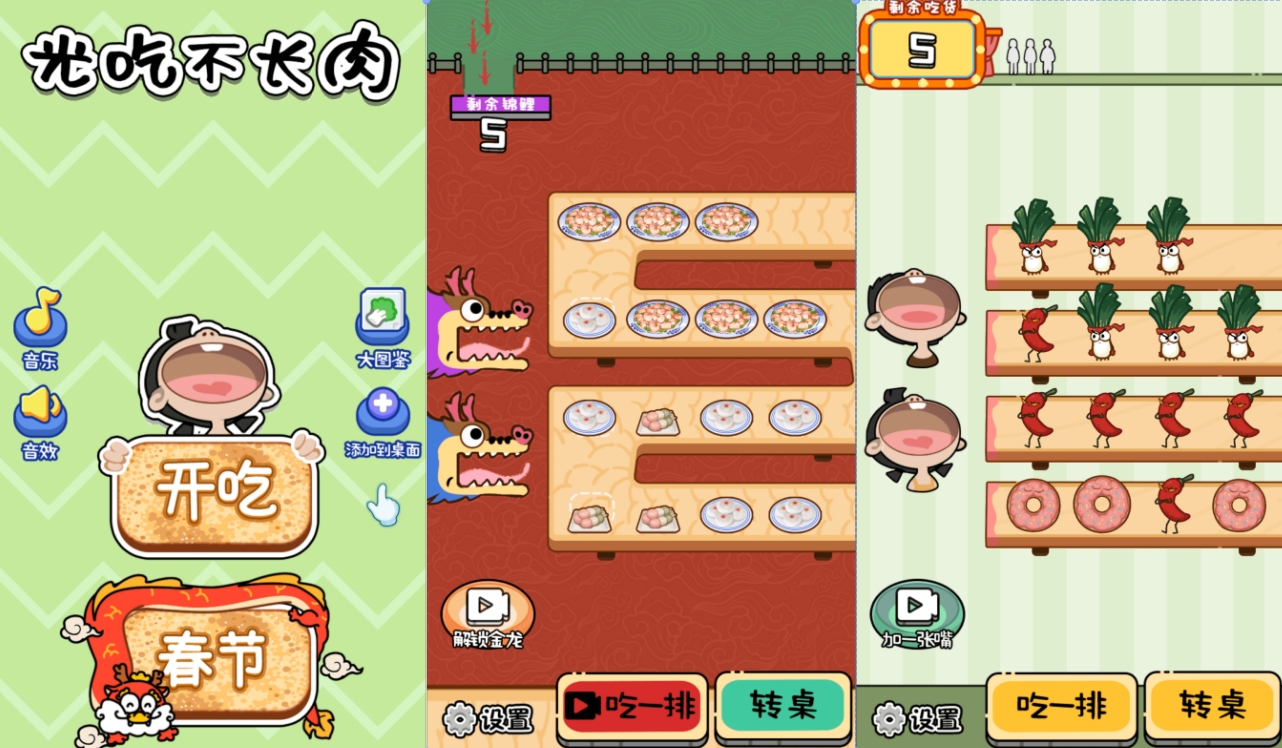 与其他大胃王手游不同,它里面需要玩家同时操纵多个大胃王角色,并且进食方式类似于自助转盘,可以随时随地转动桌子让角色吃到新的美味,同时也可以自由决定进食速度,无论是一口一盘菜还是一下吃一排的壮举都能在这里见证,画风方面则是Q版幽默风格,还有着轻松的音乐和完整的图鉴让你能更加轻松且有准备的进行对局。