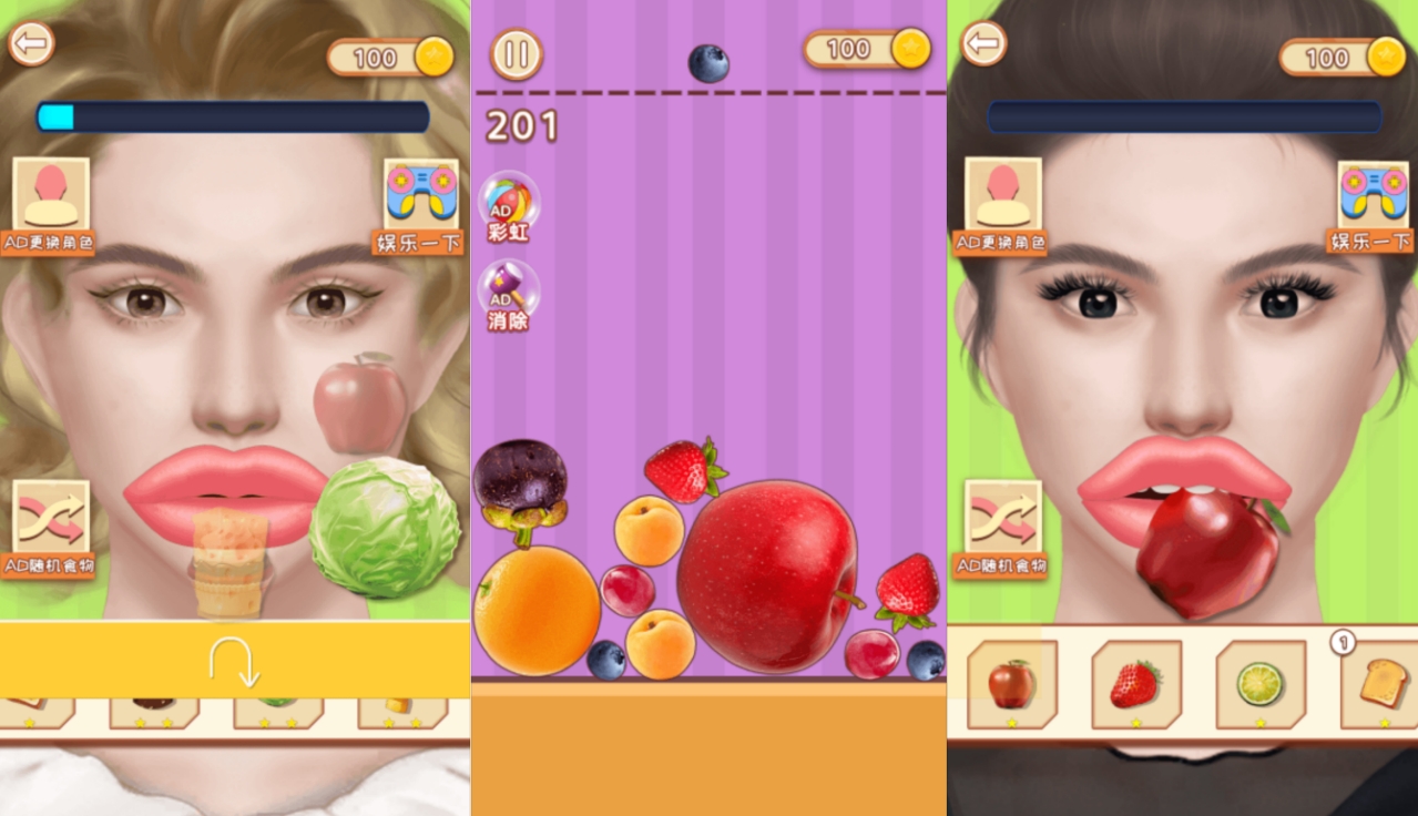 玩家将操控拥有大嘴巴的美女大胃王对各种食物进行狼吞虎咽,整体画面清新明亮,同时拥有多种角色形象和食物种类供你自由选择,随着吃下食物数量的增加,界面上方进度条也会推进,推进到满值后即可视为挑战胜利,因此在玩法和操作上都相当简单明了,并且关卡过程中还可通过娱乐一下选项进入消除小游戏放松休闲,缓解通关压力。