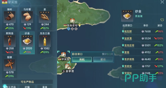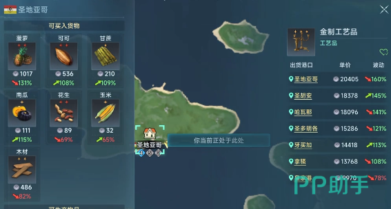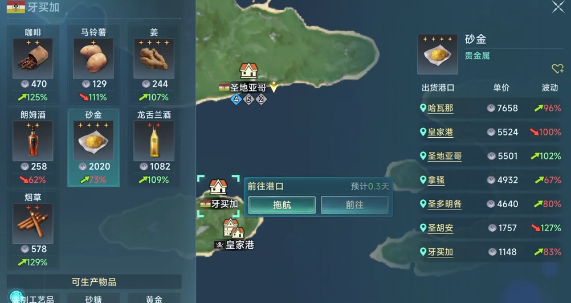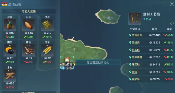 金制工艺品在圣地亚哥的卖价会直接达到160%,因此还是非常可观的。其中圣地亚哥主要是生产木材,牙买加主要是生产金沙,会拥有比较不错的生产条件。因此这里就需要开采一个完整的商业循环。