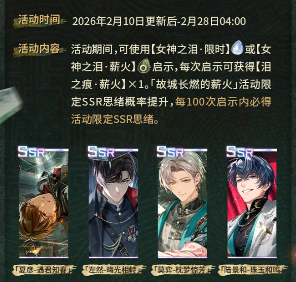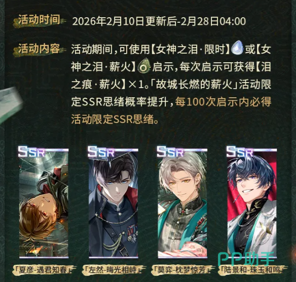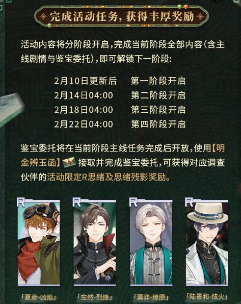除卡池外,主线活动「珍宝解密」同步开启。活动自2月10日版本更新后启动,全程划分为四个递进阶段,最终阶段于2月22日解锁。每阶段开放对应章节剧情,并逐步释放「珍宝委托」系统。玩家需使用「明金辨玉函」接取委托任务,在完成调查推理后,可获得四位男主R级思绪卡、限定邀请函「墓道惊魂」及其他稀缺养成材料。
