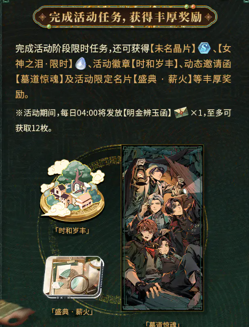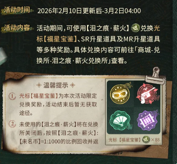 活动期间设有动态限时任务,完成后可领取未名晶片、蓝色女神之泪(限时)、活动徽章「时和岁丰」、动态邀请函及限定名片等多重奖励。此外,玩家还可通过日常参与收集「泪之痕·薪火」,用于在「薪火兑换所」内兑换SR/MR升星素材、技能书、记忆碎片等关键培养资源。