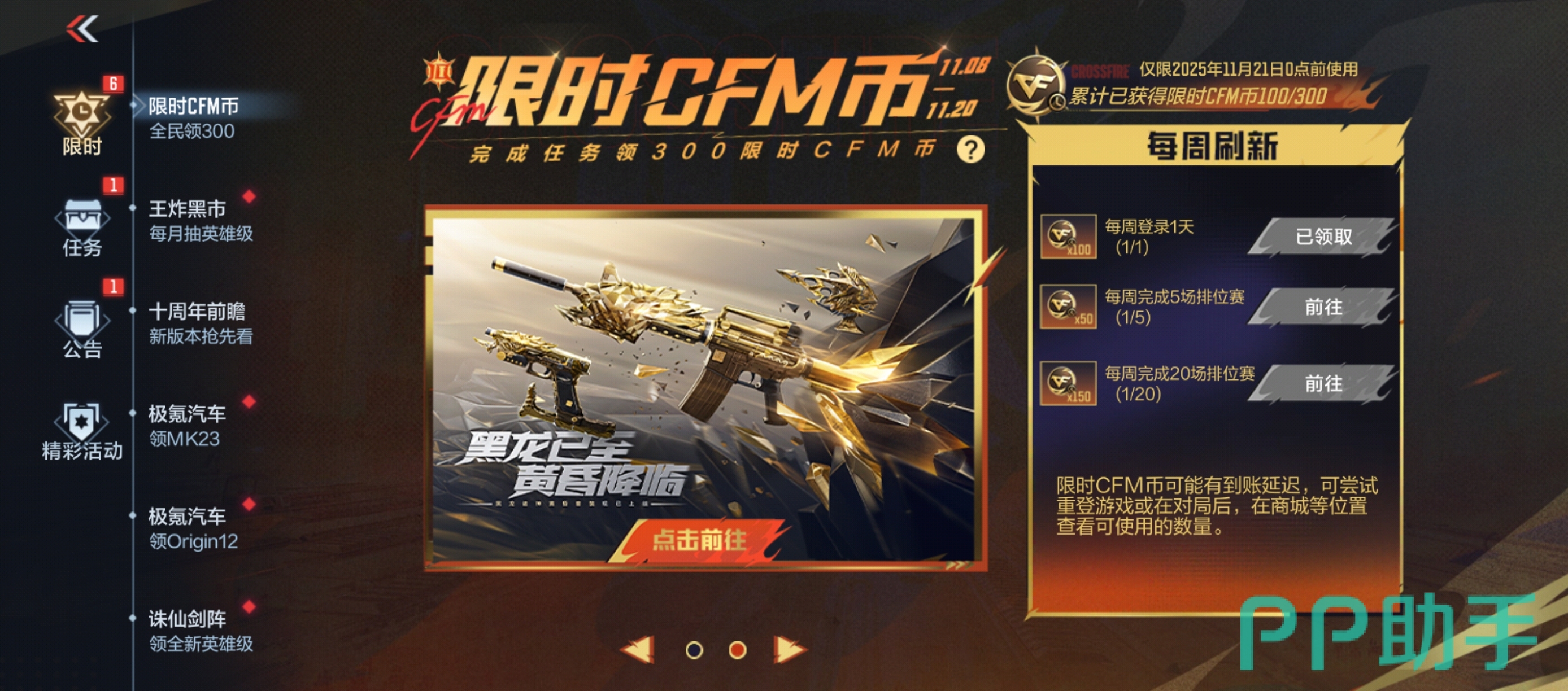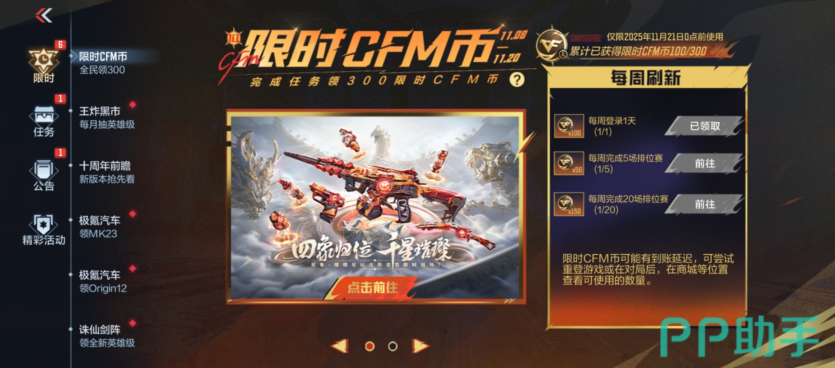 需要特别提醒的是,所有限时cfm币均设有有效期限。以本次2025年11月活动所获的300枚为例,其使用截止时间为2025年11月21日,逾期未使用的部分将自动清零。因此,玩家在获取后应尽早安排用途,避免因过期造成资源浪费。同时,部分任务需满足特定条件才能完成,建议提前了解规则并做好时间安排。