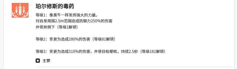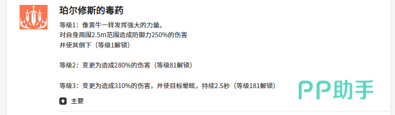 一技能【珀尔修斯的毒药】以自身防御力为伤害基数,对半径2.5米内所有敌人造成250%防御力值的范围伤害。该技能具备倒地触发效果——命中后有一定概率使目标陷入倒下状态,从而为后续连招或队友集火创造有利窗口。值得注意的是,克罗伊基础防御越高,此技能的基础伤害量级越显著提升。